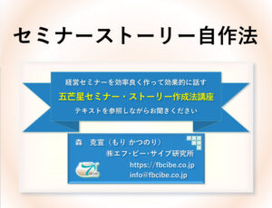 先生方が、最終的に提案されたい案件に繋ぐ《セミナー》の作り方の講座は、既に申し上げた通りリニューアル中です。ただし、セミナーではなく《提案ストーリーの作り方》なら、別途ご用意があります。