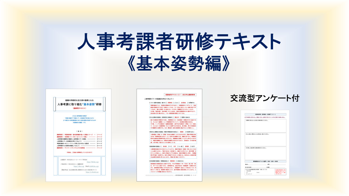 先生方が人事考課者研修を実施される際の「考課者研修テキスト」(基本姿勢編)のみをご購入の際には、本ページで商品をカートに入れてお申込ください。要点確認編と模擬実践編を含む3部作からなる研修の全容をご確認になるには、こちらのページをご参照ください。