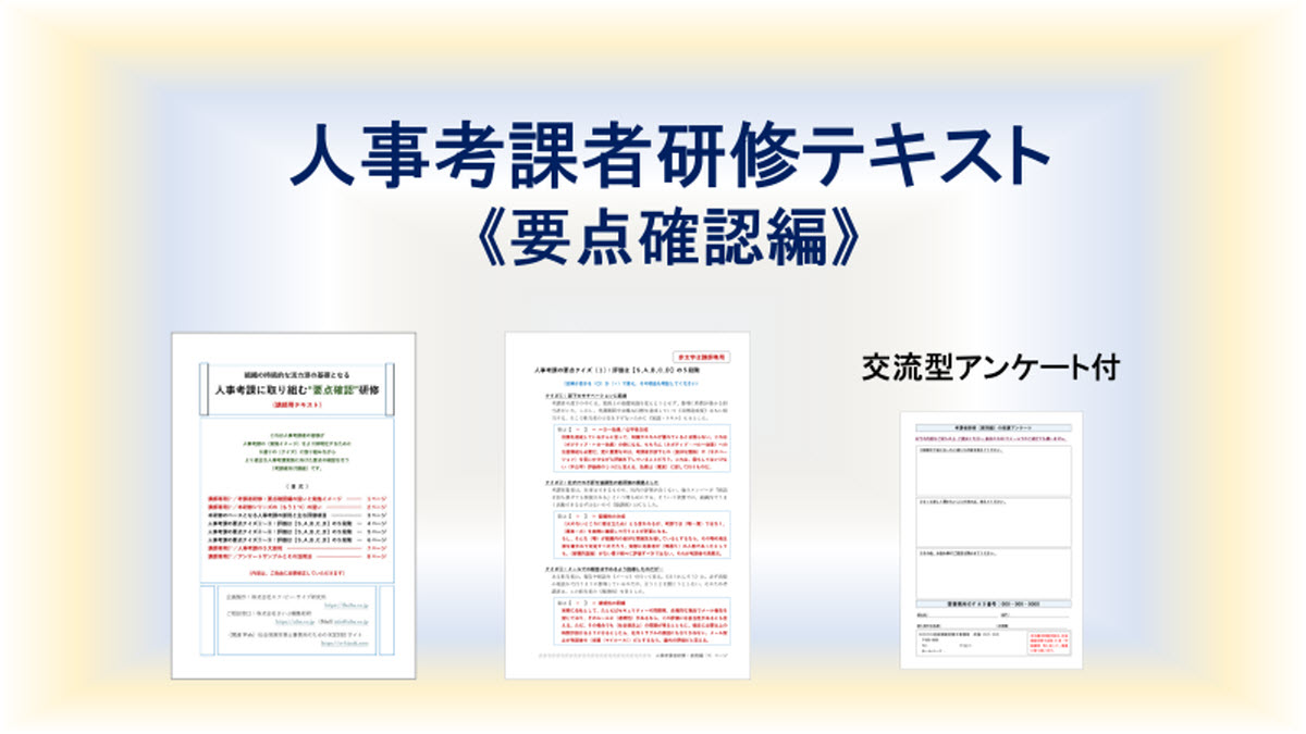 先生方が人事考課者研修を実施される際の「考課者研修テキスト」(要点確認編)のみをご購入の際には、本ページで商品をカートに入れてお申込ください。基本姿勢編と模擬実践編を含む3部作からなる研修の全容をご確認になるには、こちらのページをご参照ください。